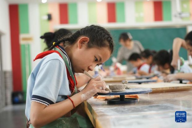 江蘇南京市曉莊小學(xué)學(xué)生在課堂上制作泥塑