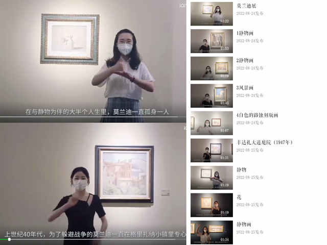 當下,聽力障礙群體在已有群體基數大的情況下呈現遞增趨勢,聽障群體文化藝術方面的需求日益增加。這支大學生社會實踐團除了為聽障人士開設公益專場外,還精選了此次展覽中的9幅作品,專門錄制了手語導覽視頻,最終匯聚成一張手語二維碼小卡片,從而方便更多聽障人士走進場館、了解莫蘭迪藝術創作背后的故事,提升觀展體驗。