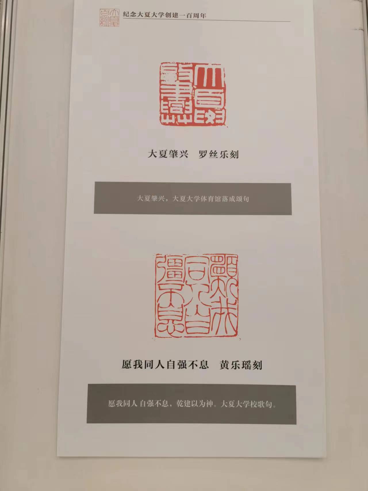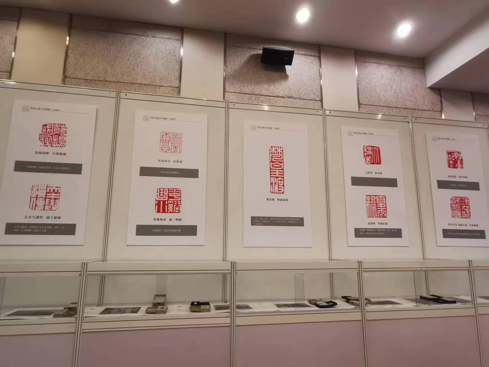 現場展示了28方以“大夏百詠”為主題的高清放大篆刻作品。其中,程羽瑄同學所刻“南明溪”取法細朱文,靜雅秀逸。張靜怡同學的“群賢堂”取法古璽,呈盾牌狀,使用晉系文字,風格雅致。黃樂瑤同學“愿我同仁自強不息”出自大夏大學校歌句,風格取法趙之謙,空間變化多樣。