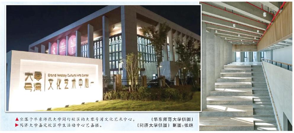 坐落于華東師范大學(xué)閔行校區(qū)的大零號灣文化藝術(shù)中心。(華東師范大學(xué)供圖) 同濟(jì)大學(xué)嘉定校區(qū)學(xué)生活動中心藝嘉樓。 (同濟(jì)大學(xué)供圖)制圖:張繼