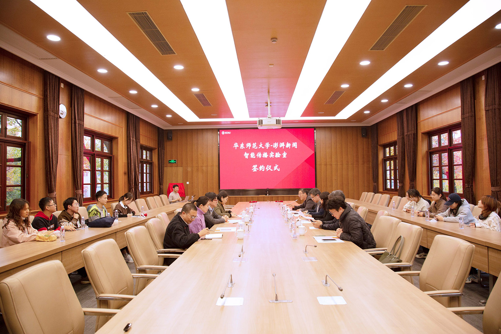 2023年11月23日下午,華東師范大學與澎湃新聞攜手建立的“華東師范大學-澎湃新聞”智能傳播實驗室簽約儀式在華東師范大學(中山北路校區)辦公樓小禮堂舉行。