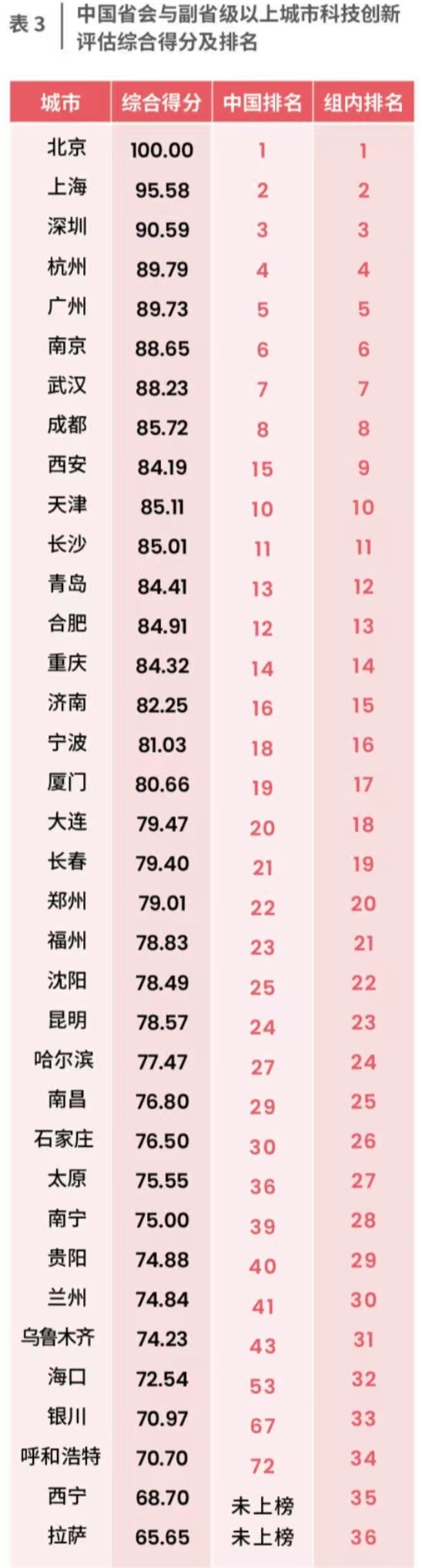 值得注意的是,“黑河—騰沖”劃分中國人口密度的對比線——胡煥庸線,也是中國科技創新發展的分界線,東西兩側科技創新發展極不平衡。以胡煥庸線為界,綜合排名前100強的城市中,僅有蘭州、烏魯木齊、銀川、呼和浩特、包頭5個城市處于胡煥庸線以西,其余的95個城市分布在胡煥庸線以東。