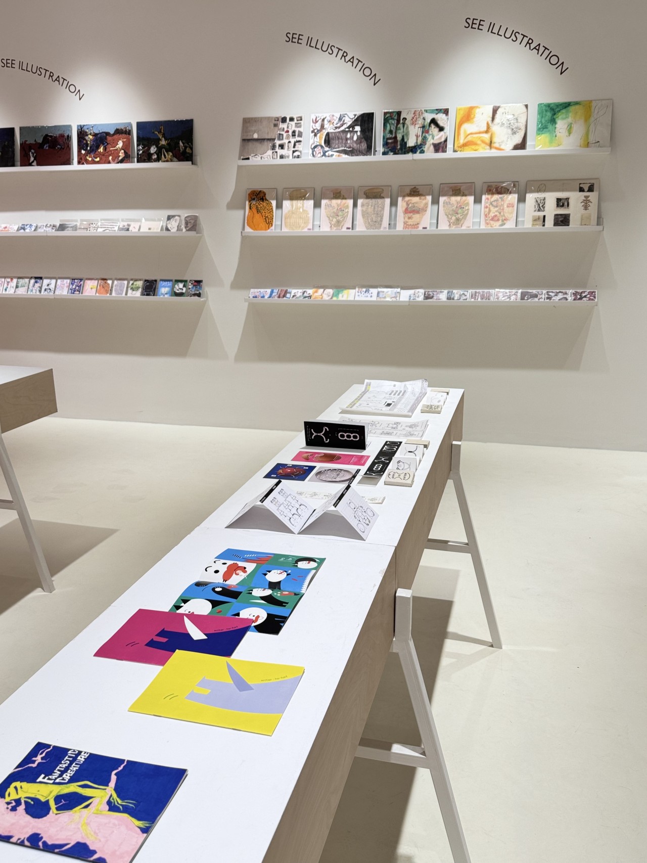 在中海環(huán)宇城MAX的一樓,POMPON實體店就坐落在這里。整個空間分成兩個部分,在展覽區(qū),可以看到來自青年藝術家倪好的三幅大型油畫,色彩大膽明快。再往里走,插畫專業(yè)學生們的優(yōu)秀作品被制作成精美的明信片、裝飾畫,擺放在貨架上,而主打生活雜貨的POMPON文創(chuàng)擺放在店內最顯眼的位置,時髦的編織手提袋、有趣涂鴉的餐盤、可愛發(fā)夾,包括《Hudec's Bakery》的裝飾畫……讓整個文創(chuàng)空間充滿了時尚、年輕、活潑的味道。