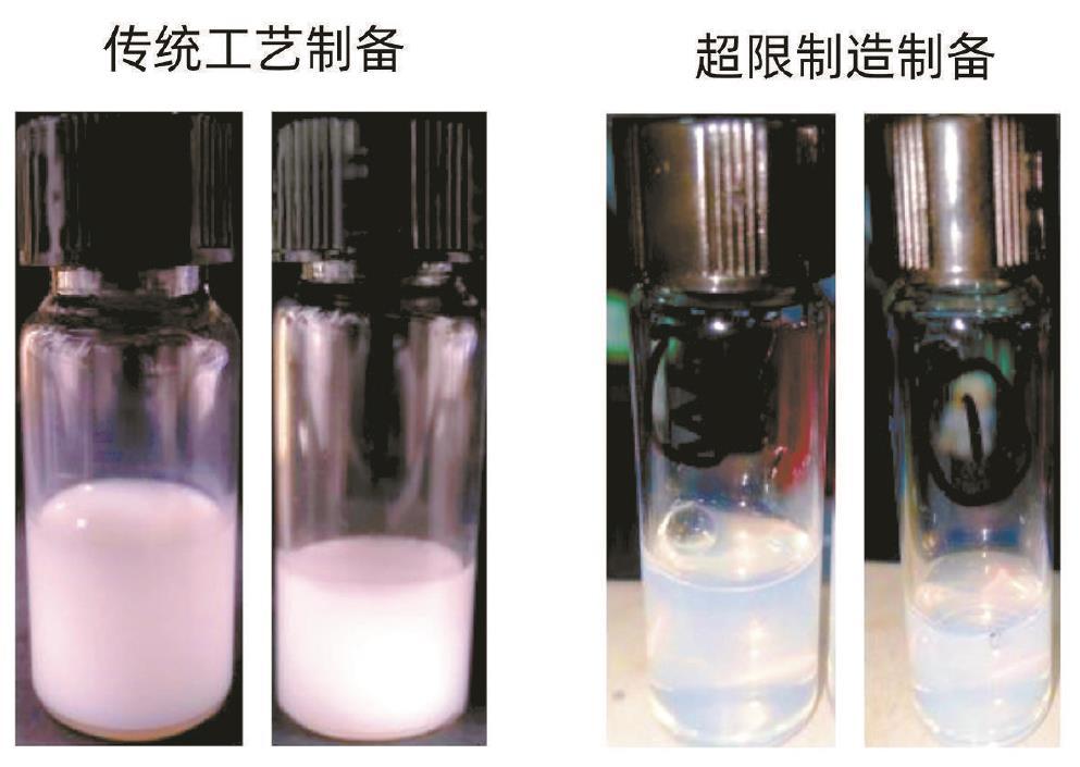 超限制造能使化妝品中的維生素E粒徑從過去的幾百納米縮小到幾十納米,粒徑分布大大窄化,外觀澄清通透泛藍光。(錢旭紅供圖)