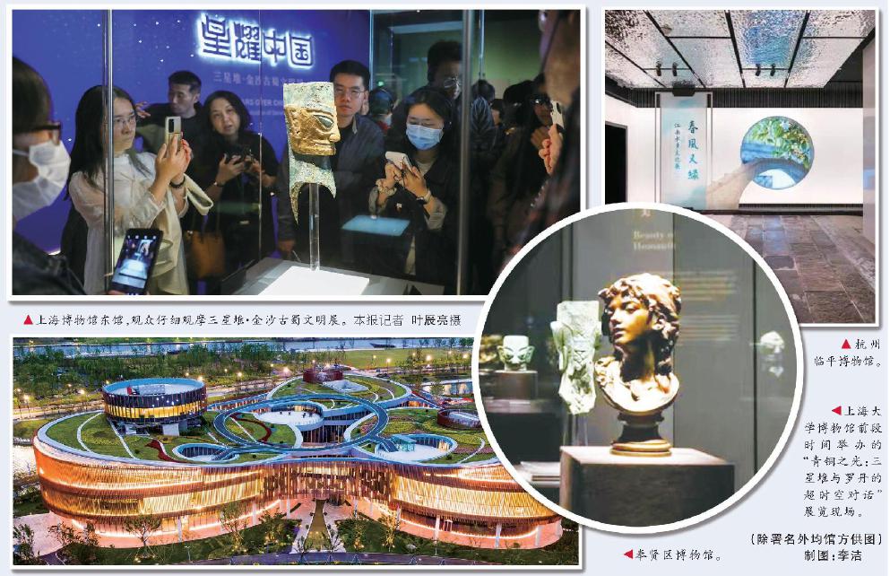 上海博物館東館,觀眾仔細(xì)觀摩三星堆·金沙古蜀文明展。本報(bào)記者 葉辰亮攝 杭州臨平博物館。 上海大學(xué)博物館前段時(shí)間舉辦的“青銅之光:三星堆與羅丹的超時(shí)空對(duì)話”展覽現(xiàn)場(chǎng)。 奉賢區(qū)博物館。 (除署名外均館方供圖)制圖:李潔