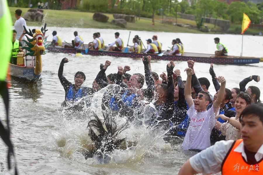 “ECNU!ECNU!ECNU!”5月25日下午,杭州灣邊,通海湖畔,迎端午、賽龍舟——華東師范大學留學生龍舟隊奪冠后難掩興奮之情,“撲通撲通”紛紛跳入河道,接受岸上中外觀眾對他們校名縮寫的陣陣歡呼。與去年一樣,蟬聯冠軍的男女混合團隊享受了“特權”——全體跳船、入水慶功……
