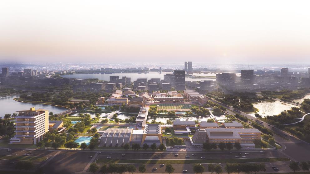 臨港新片區,滴水湖畔,一所“未來學?!薄虾5嗡W校(籌)已經漸露雛形。從空中俯瞰,各種庭院式的學習活動空間錯落有致地分布在穿校而過的春漣河兩岸。