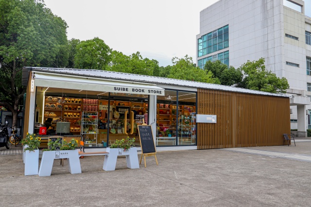上海對外經貿大學這一年來全新推出了三座校園書房。從北門進入學校,便能看到一家裝修精致又不失簡約的書房。這是由集裝箱改建而成的校園書房,書房用以展示銷售校園紀念品,并提供閱讀空間,展呈師長薦書,并推出“朗讀者”專架。閑暇時,三兩好友一起走走停停,讀好書、淘文創。