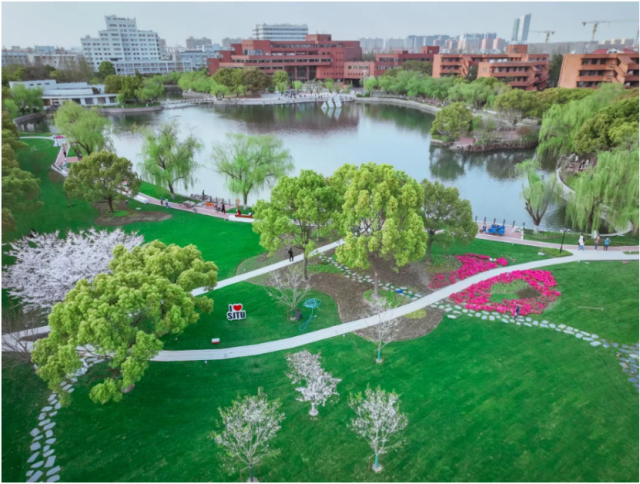 落日時分,湖面映著晚霞,這是上交學子一天課后最愛散步的地方。石材鋪地與嵌草汀步相結合,組成一條蜿蜒小路;湖畔仰思坪南側香樟林郁郁蔥蔥,枝繁葉茂的樹林成為入校第一景;湖邊增設步行景觀平臺和親水木質座椅及樹蔭下的石材座椅,為交大人提供更多的湖畔休憩選擇。