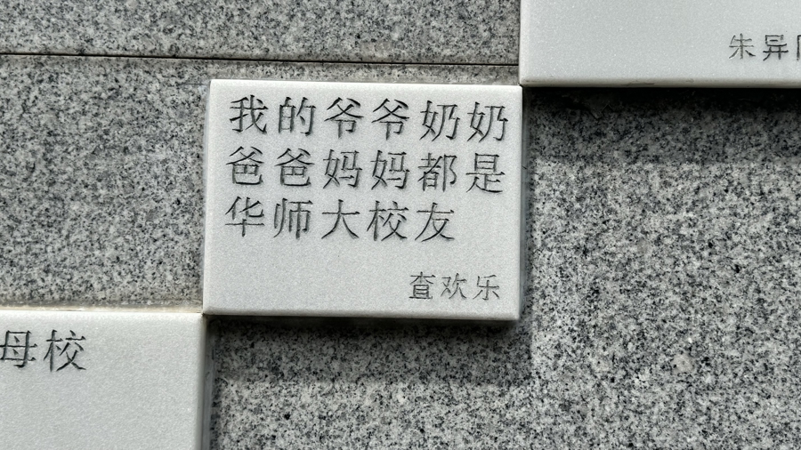 在校慶捐贈紀念墻上,查建渝兒子查歡樂說:我的爺爺奶奶爸爸媽媽都是華師大校友。
