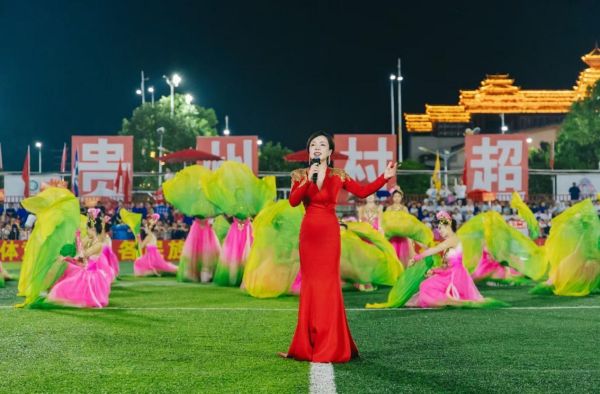 6月29日晚,兩校師生在“村超”賽場上表演歌伴舞《我愛你中國》(領唱為華東師范大學石春軒子教授)