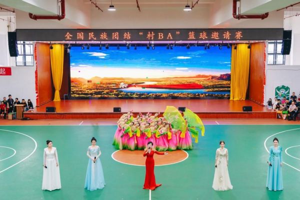 6月29日,兩校師生在全國民族團結“村BA”籃球邀請賽決賽賽場上表演歌伴舞《我的祖國》(領唱為華東師范大學石春軒子教授)