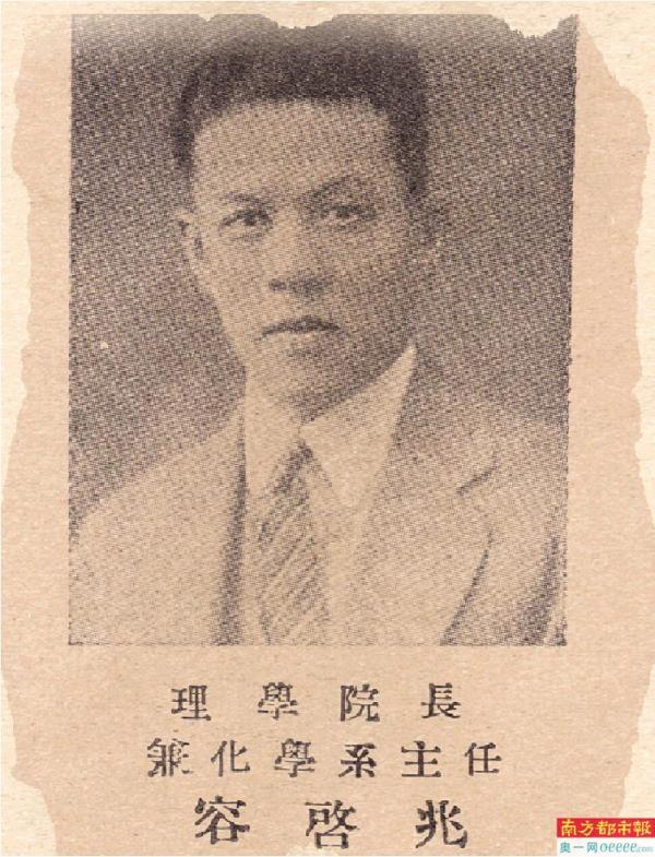 容啟兆出生于1898年,廣東香洲南屏(今屬珠海)人。他早年就讀于北京清華學(xué)校(清華大學(xué)前身),1919年8月由學(xué)校公派赴美留學(xué),先后獲塔夫茨大學(xué)化學(xué)工程學(xué)士、弗吉尼亞大學(xué)化學(xué)碩士及哲學(xué)博士學(xué)位。學(xué)成歸國后,容啟兆于1925年入職光華大學(xué),先后任化學(xué)系教授、理科主任,副校長兼理學(xué)院院長等職。