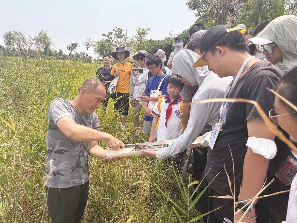 頭頂36攝氏度高溫,腳踩泥濘土地,上海市控江中學高二學生陸天沐來到位于金山區的鸚鵡洲生態濕地公園,用金屬采樣器采集到了約40厘米長的濕地土壤標本。