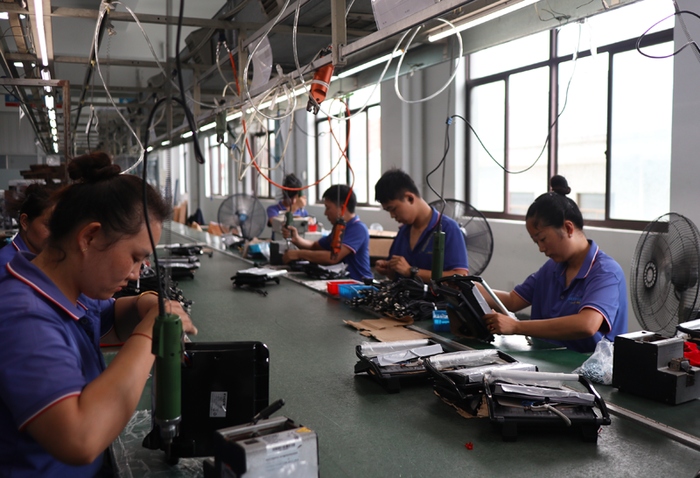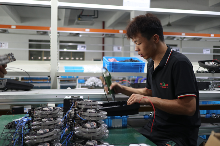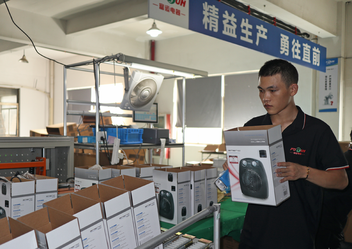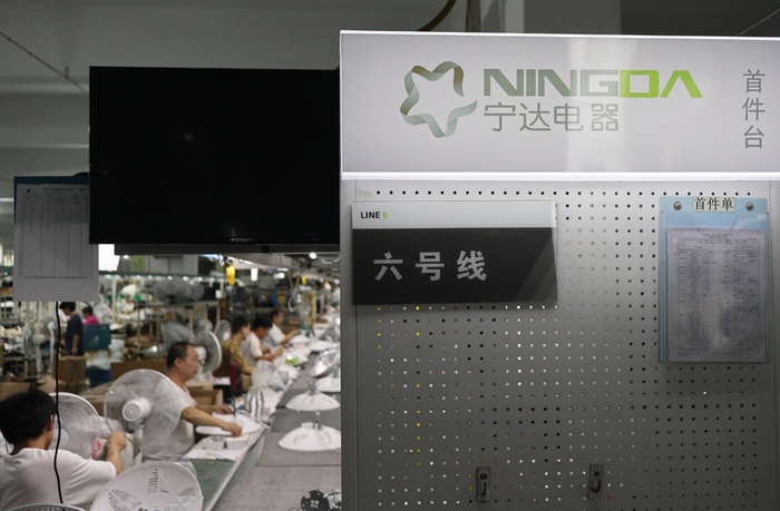 在離艾肯智不遠的寧波寧達電器有限公司內同樣一派繁忙的景象:組裝、測試、裝箱 、貼標……一臺臺電扇正被生產出來等待發貨。公司總經理余輝向界面新聞介紹,這款電扇采用腳踩式設計“懶人友好”,不用彎腰就能輕松操控,在韓國等市場成為了爆款,年銷售額超過150萬美金。