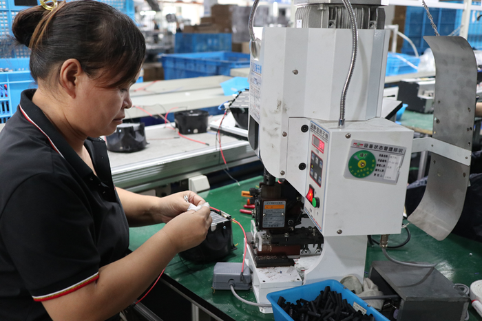 一名工人正在使用超靜音端子機對產品電線進行末端加工 攝影:范易成