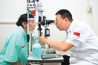 4月25日,在斯里蘭卡科倫坡,昆明醫科大學第一附屬醫院醫生鐘華(右)為患者進行術后復查。新華社記者 陳冬書攝