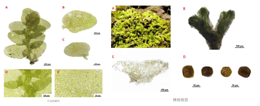 天目疣鱗苔(圖左)、稀枝錢苔。