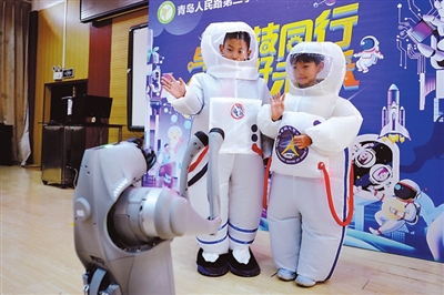 ②山東省青島人民路第二小學兩名身穿“宇航服”的學生與仿生機器狗互動。王海濱 攝