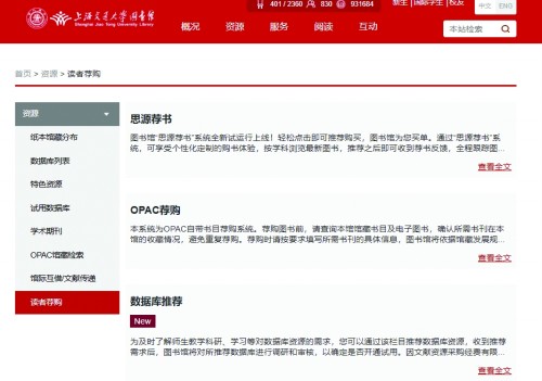 華東師范大學則是從2017年開始有專門的綠色通道來接受讀者薦購。“當然我們有一個評估,評估標準中價格是其次,主要看薦購的需求是否合理。的確是讀者所需,就算貴一點,我們還是會盡量滿足。”華師大圖書館資源建設中心主任段雙喜表示,“尤其是一些大套的叢書,一般師生無力購買的,我們圖書館要給他們兜底。”