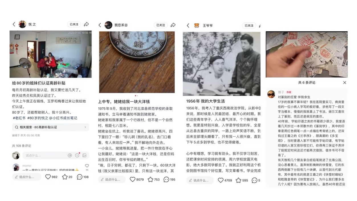 小紅書的數據顯示,截止2024年底,60歲以上的老年月活躍用戶已超過3000萬。他們不僅“刷”小紅書,而且主動分享生活、創作內容。老年創作者的數量在過去兩年增長了三倍,累計已發布筆記超過 1 億篇。網友們親切地把老人們分享的故事稱為“老紅書”。