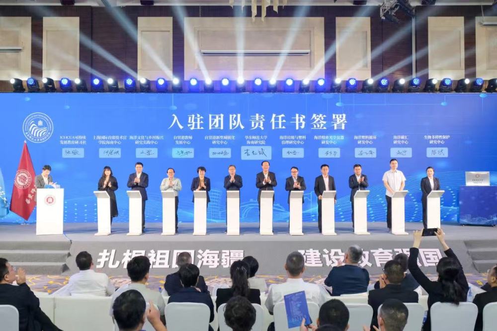 揭牌儀式上,海南研究院入駐團隊負責人共同上臺簽署了《入駐責任書》,承諾將“扎根祖國海疆、建設教育強國”。