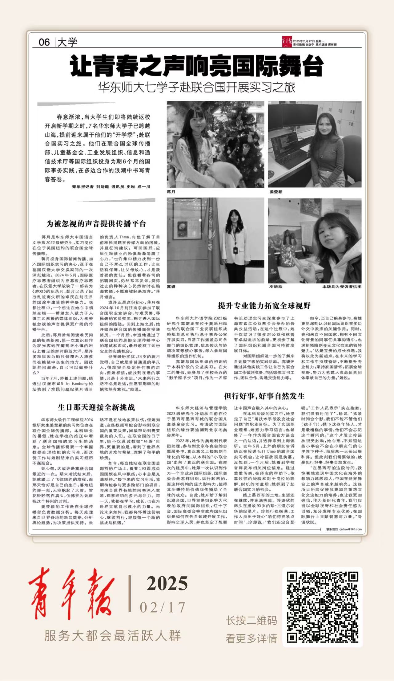 春意漸濃,當大學生們即將陸續返校開啟新學期之時,7名華東師大學子已跨越山海,提前迎來屬于他們的“開學季”:赴聯合國實習之旅。他們在聯合國全球傳播部、兒童基金會、工業發展組織、信息和通信技術廳等國際組織投身為期6個月的國際事務實踐,在多邊合作的浪潮中書寫青春答卷。