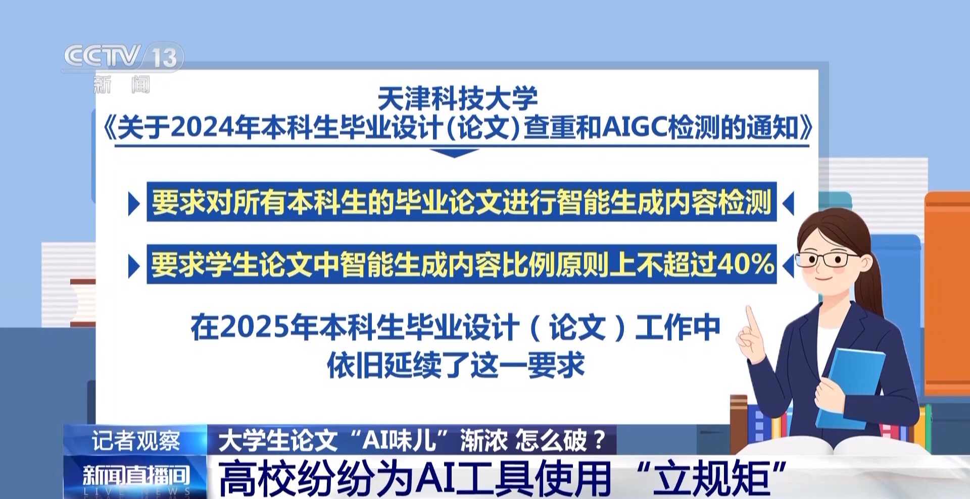 天津科技大學去年發布了《關于2024年本科生畢業設計(論文)查重和AIGC檢測的通知》,要求對所有本科生的畢業論文進行智能生成內容檢測。要求學生論文中智能生成內容比例原則上不超過40%。在2025年本科生畢業設計論文工作中,依舊延續了這一要求。
