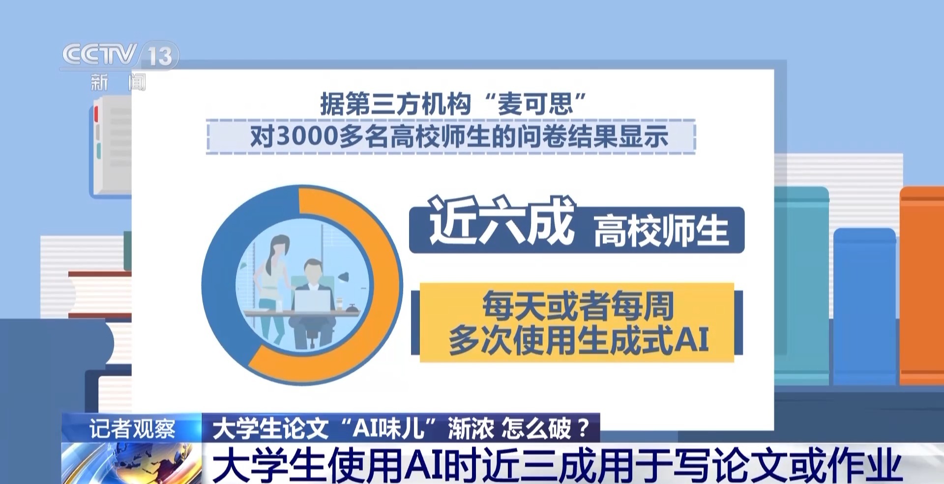 據第三方機構“麥可思”對3000多名高校師生的問卷結果顯示,近六成高校師生每天或者每周多次使用生成式AI。而大學生在使用生成式AI時,有近三成主要用于寫論文或作業。采訪中,一些學生也坦言,在寫報告或論文時,他們會直接復制粘貼AI生成的內容。