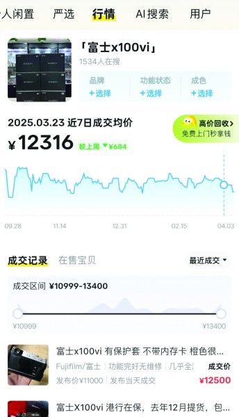 二手市場情況同樣熱烈,根據閑魚行情顯示,二手大疆pocket近七日成交均價為3400元,和原價基本持平,此前一周,二手均價甚至近4000元。而二手富士X100Ⅵ近七日成交均價為12316元,高出原價近千元。