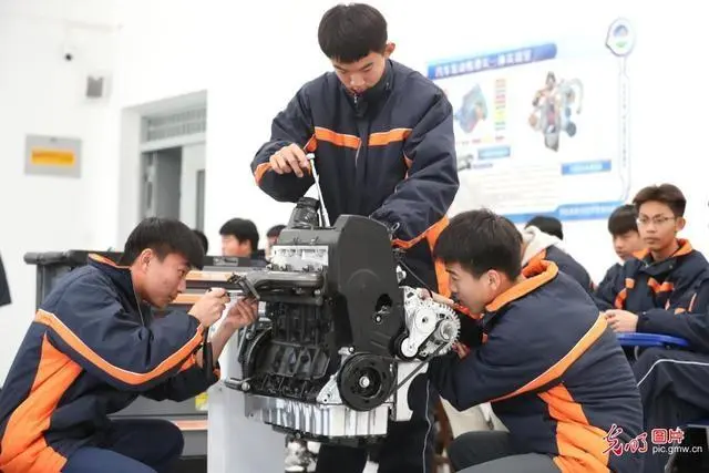 河北省石家莊市井陘縣職業技術教育中心,學生進行汽車發動機拆解實訓。王保龍攝/光明圖片