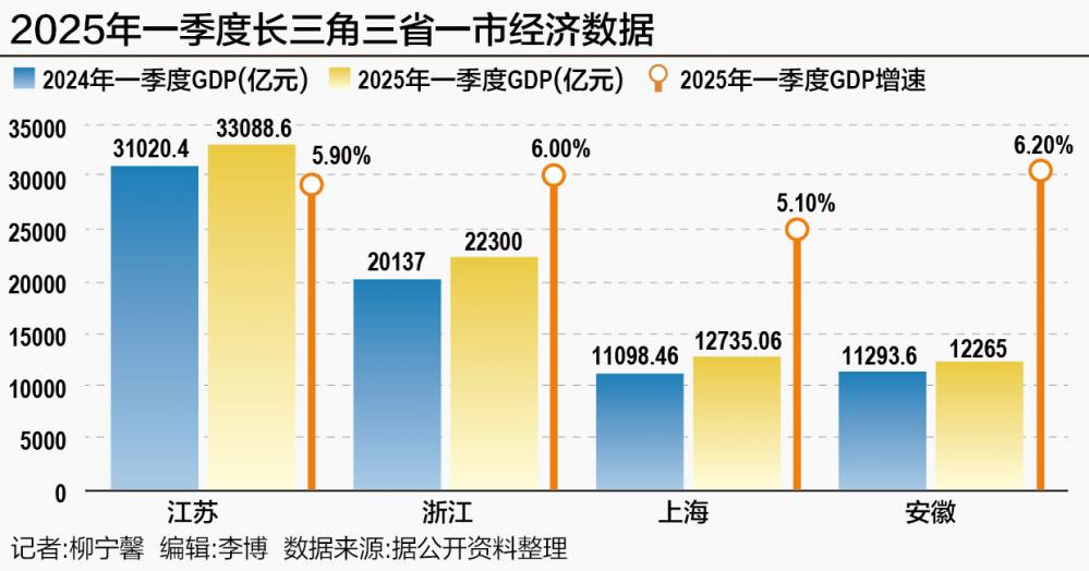 分省份看,一季度江蘇實現地區生產總值33088.6億元,同比增長5.9%;浙江GDP為22300億元,同比增長6.0%;上海GDP達到12735.06億元,同比增長5.1%;安徽GDP為12265億元,同比增長6.2%。