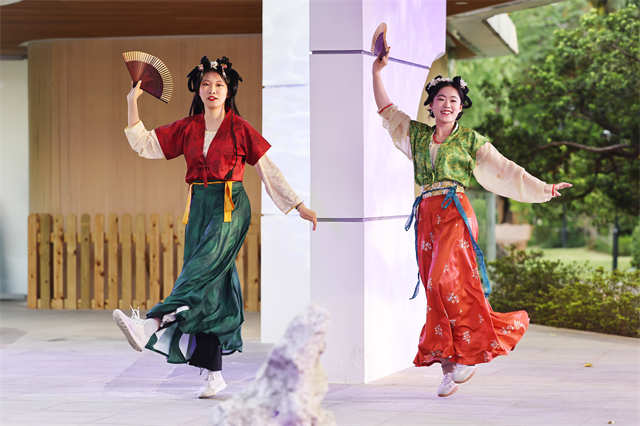 華東師范大學(xué)2023級哲學(xué)系本科生陳嘉怡是學(xué)校洛瑛漢服社社長,她告訴記者,這次社團(tuán)一共為走秀環(huán)節(jié)派出了一支8名演員的隊(duì)伍和6名志愿者。大家很榮幸能夠參與其中,并深深感受到中華優(yōu)秀傳統(tǒng)文化的魅力。“漢服之美,美在形制,更美在文化內(nèi)涵。今天,好多名漢服社成員都穿上了唐制齊胸衫裙,這也彰顯了唐代文化多元融合、包容萬象的精神特質(zhì),是大唐盛世的服飾文化象征。”