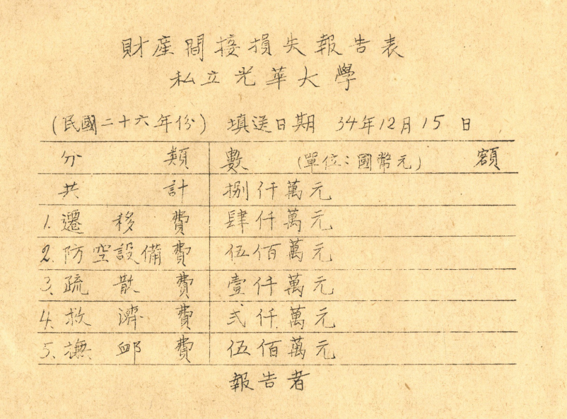 1945年12月光華大學填報抗戰期間財產損失報告表。