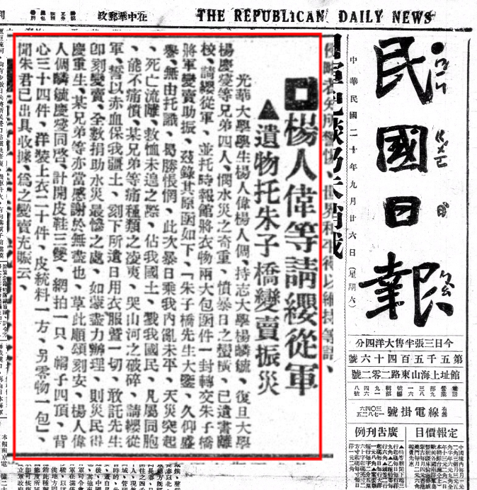 1931年9月,光華大學楊人偉、楊人倜請纓從軍抗日。圖為《民國日報》報道情形。