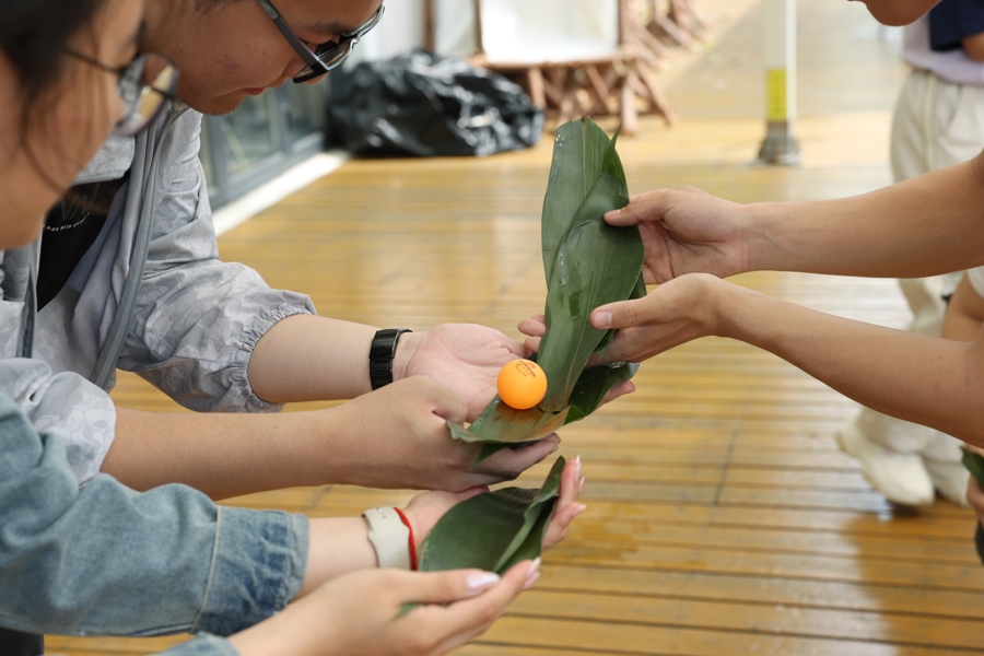 兩岸青年學(xué)生齊心協(xié)力,用粽葉連成一條“通道”,比賽將乒乓球運(yùn)到終點(diǎn)。