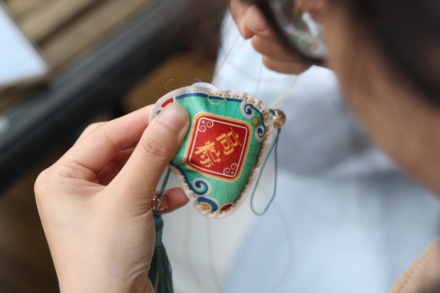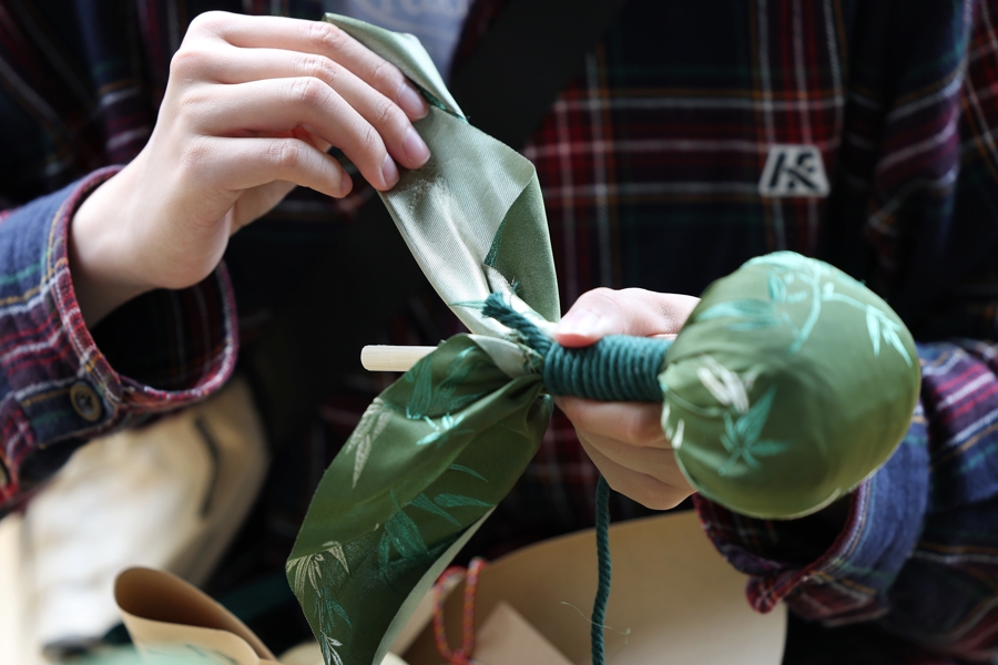 將艾草制成香囊,包裹進(jìn)繡有傳統(tǒng)花紋的織布,一圈圈纏繞上絲線……艾草錘和艾草香囊制作攤位前坐滿了來體驗(yàn)的學(xué)生和家屬。“這是我第一次制作艾草錘,每繞一圈絲線都需要系緊,密織和打結(jié),很花心思。我想將這份親手制作的禮物送給長輩,既能傳達(dá)心意,又蘊(yùn)含著傳統(tǒng)文化內(nèi)涵?!眳⒓蝇F(xiàn)場制作的吳同學(xué)告訴記者。現(xiàn)場還有不少親子家庭在老師的帶領(lǐng)下體驗(yàn)傳統(tǒng)手作的趣味。