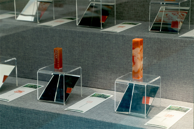 方寸見天地,家風傳古今。在中國婦女兒童博物館三樓展廳平臺,正陳列著華東師范大學美術學院書法篆刻方向師生、校友共同創作的110方篆刻原石。其中,由原石鈐拓而成的20米手卷尤為引人注目,展廳中還懸掛著46方高清放大的印蛻。