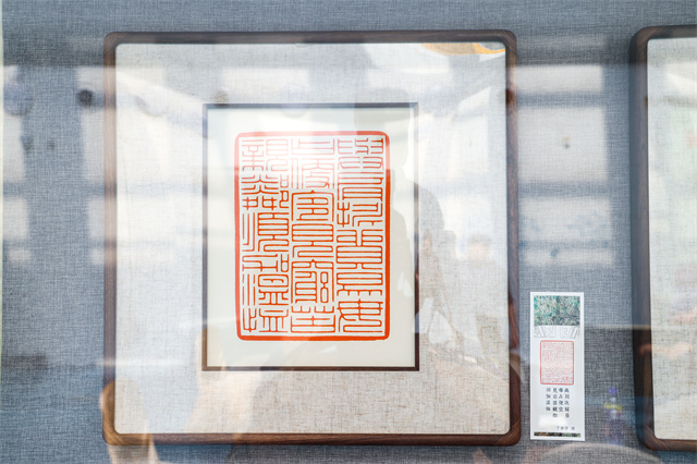 “與肩挑貿易,毋占便宜;見窮苦親鄰,須加溫恤”,這是2024級書法篆刻方向研究生丁寧宇的參展作品。現場還展出了高清放大的印蛻,顯得頗為壯觀。