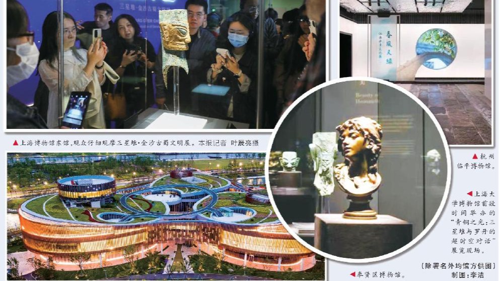 沖著曾躋身全國博物館十大精品陳列展的“春風(fēng)又綠——江南水鄉(xiāng)文化展”以及上新的特展“易水寒光——東遼金器窖藏展”,上海文博藝術(shù)愛好者王小姐上周六特地去了趟杭州,目的地是距市區(qū)近30公里的臨平博物館。過段時(shí)間,她打算再到地處蘇州城郊的吳文化博物館轉(zhuǎn)轉(zhuǎn),那里即將啟幕的特展“樹碑立傳:吳中古樹名木的故事”讓她不禁好奇。上海博物館東館,觀眾仔細(xì)觀摩三星堆·金沙古蜀文明展。本報(bào)記者 葉辰亮攝 杭州臨平博物館...