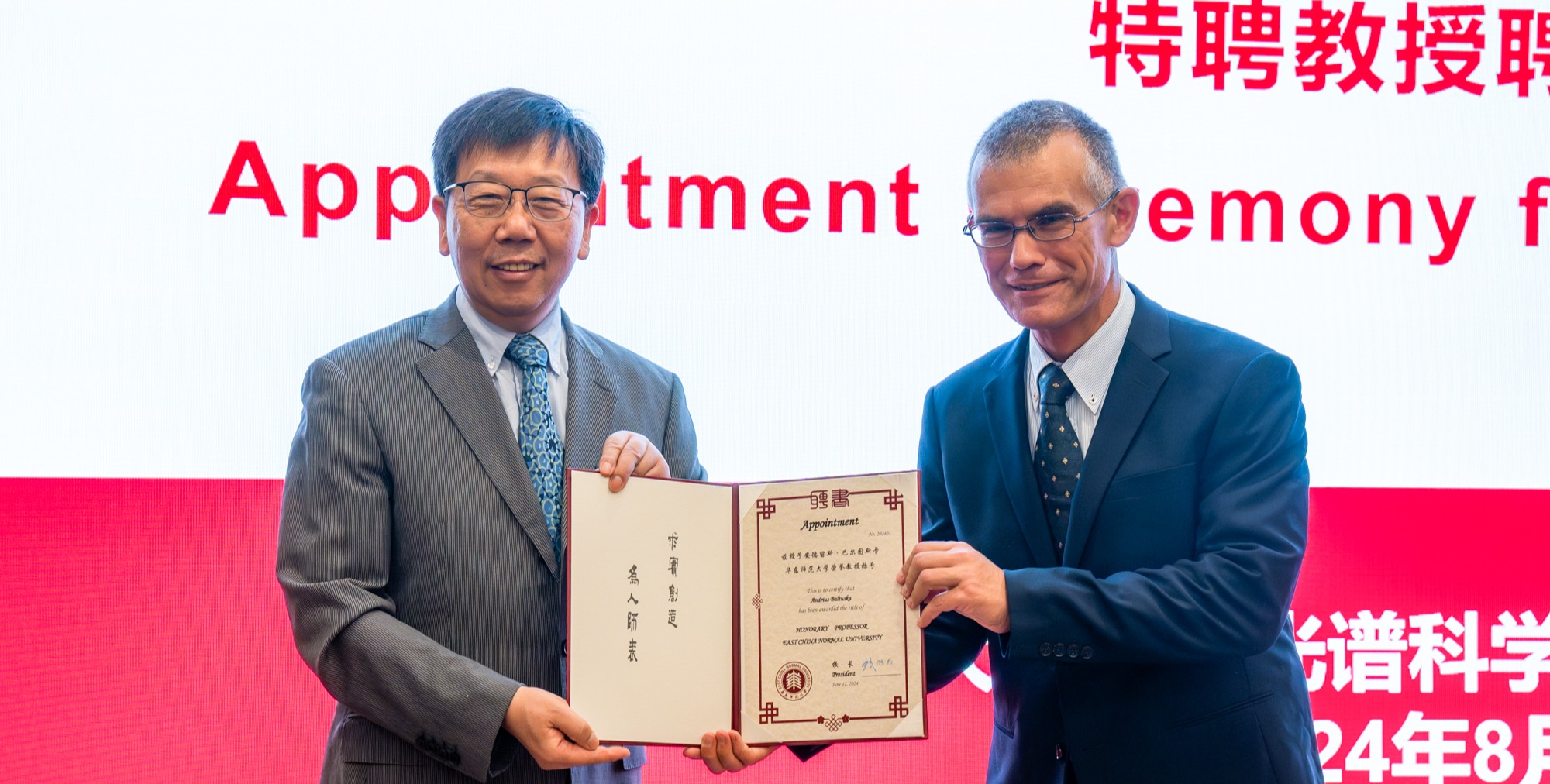 8月22日,維也納技術大學光子學研究所Andrius Baltu?ka院士受聘為華東師范大學榮譽教授。聘任儀式在閔行校區光學大樓舉行,校長錢旭紅,相關職能部門負責人以及精密光譜科學與技術國家重點實驗室師生等出席活動。聘任儀式由國際合作與交流處處長蒯曙光主持。 校長錢旭紅院士為Andrius Baltu?ka院士頒發了榮譽教授證書。精密光譜科學與技術國家重點實驗室副主任李文雪在致辭中高度評價了Andrius Baltu?ka院士在超強超...